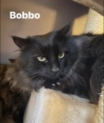 Hittades med Bonnie m.fl. (totalt 7 katter) vid ett hus i skogen där han matats ett tag av en kvinna. Flera liknande katter dök upp där, alla okastrerade och utan märkning - ett helt gäng med hemlösa kissar som behövde få komma in till Livbojen för att få nya hem. Bobbo och kompisar genomgick välbehövlig kastrering, chip, vacc och avmaskning. Bobbo har haft ett hem men han har nog aldrig blivit bra omhändertagen, han är klappar och börjar nu förstå vad skönt det är att vara inomhus och få bli ompysslad. Han är inte ännu så lätt att bära upp men socialisering pågick i jourhemmet tills han fick permanent hem.